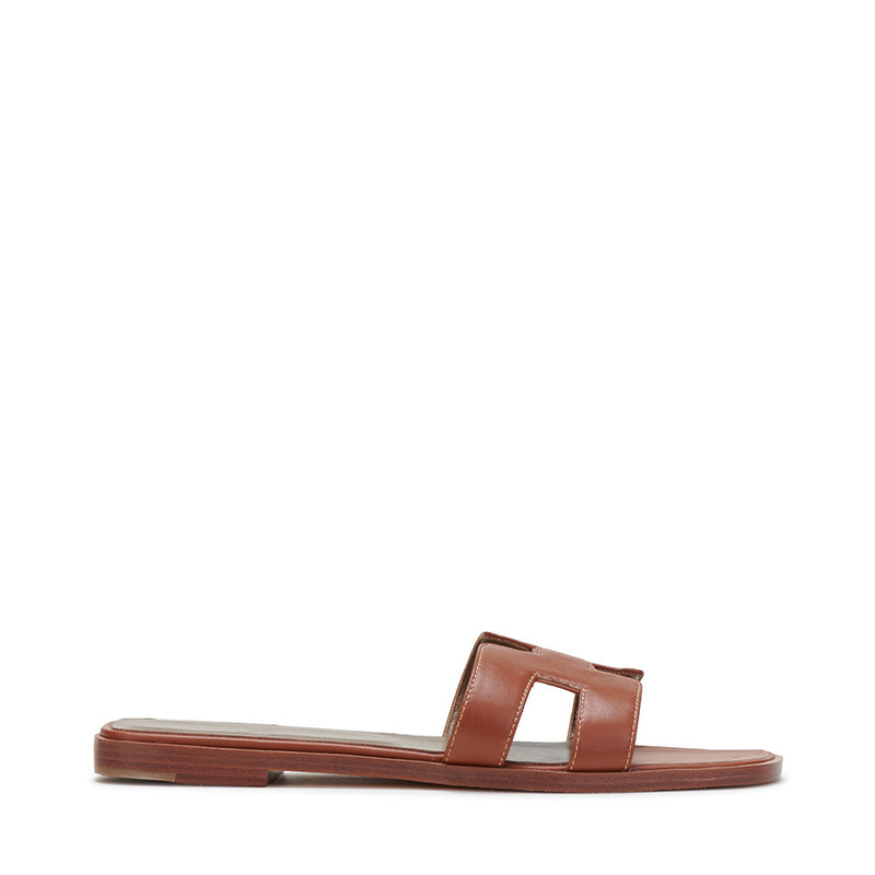 Fashion musim panas Kulit sapi coklat wanita Sendal datar dengan H berongga atas