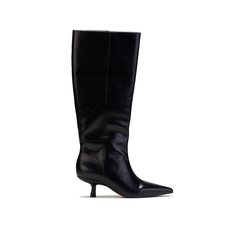 Kulit Hitam Knee-High Pointed Toe Dan Stiletto Heels OF Modern Bergaya Sepatu