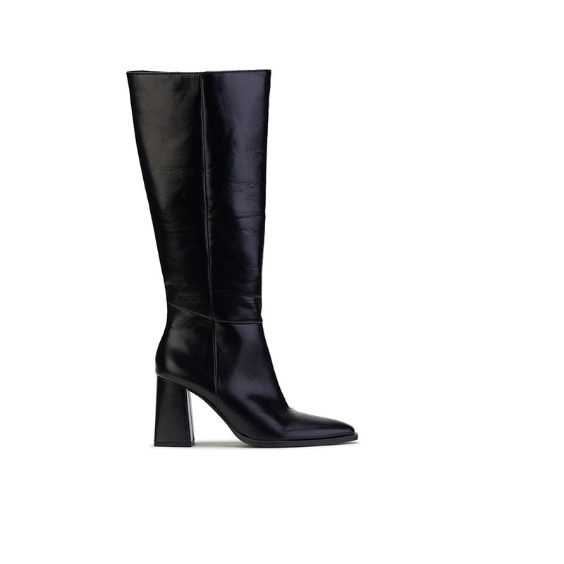 Sepatu Bot Kulit Hitam Tinggi Lutut Dengan Tumit Kuncir, Gaya Modern Dan Bergaya